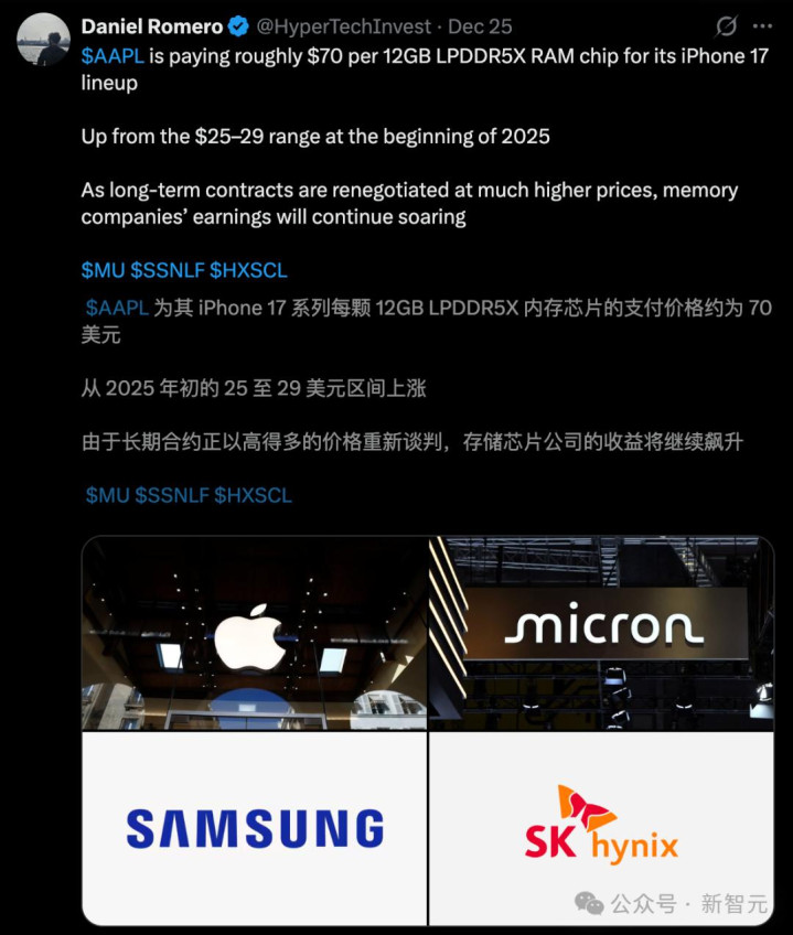 有爆料称,苹果为了iPhone 17系列,每一颗12GB的LPDDR5X内存芯片,轻便要付70好意思元。