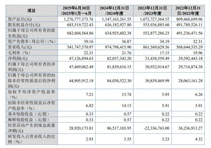 推崇期内(2022年至2025年上半年),富士智能的贸易收入永别为5.69亿元、8.62亿元、9.75亿元、5.42亿元;净利润永别为2939.24万元、3143.86万元、8203.73万元、4712.69万元。