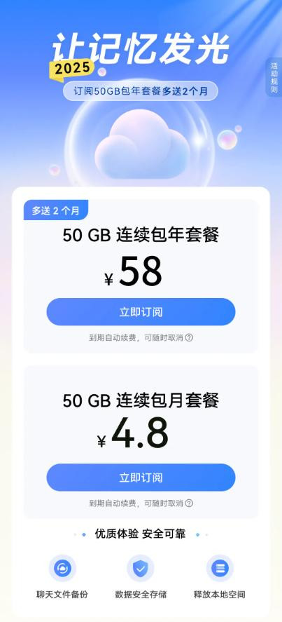 恰逢辞旧迎新,华为云空间也推出了“2025让驰念发光”优惠活动,订阅50GB相连包年套餐仅需58元,还特等获赠2个月时长。在2025年的尾声,不妨花一杯咖啡的钱,给昔时一年的驰念安个家,给新一年的精彩留足位置!